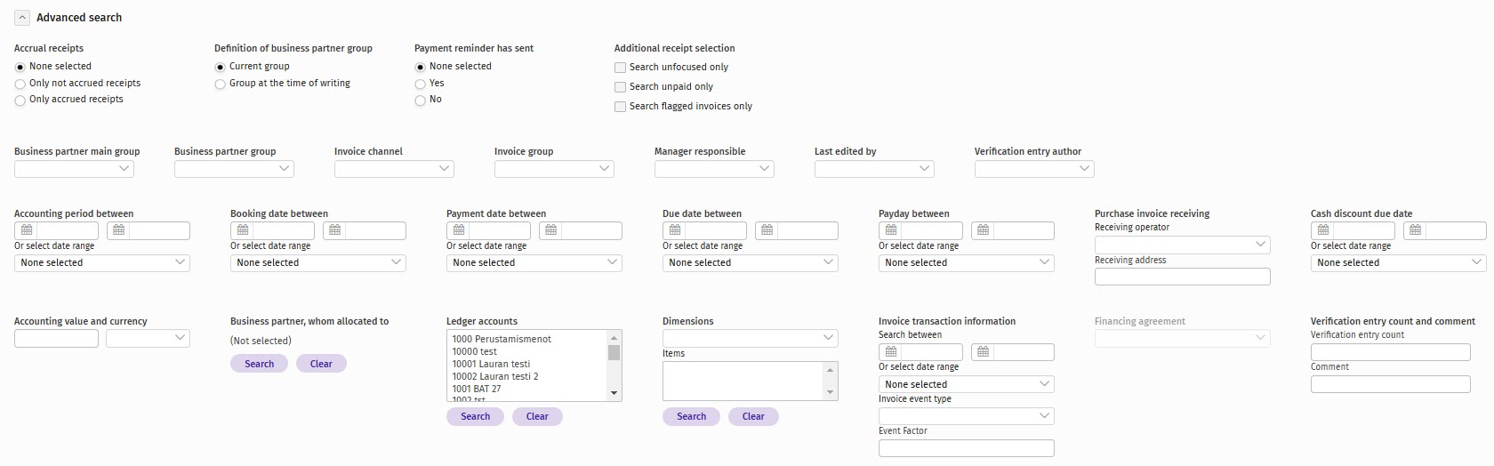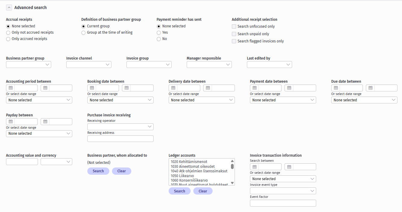 the menu includes all business partner main groups set in Procountor. When selecting a business partner main group from the menu, only receipts allocated to a business partner belonging to that main group will be included in the search.