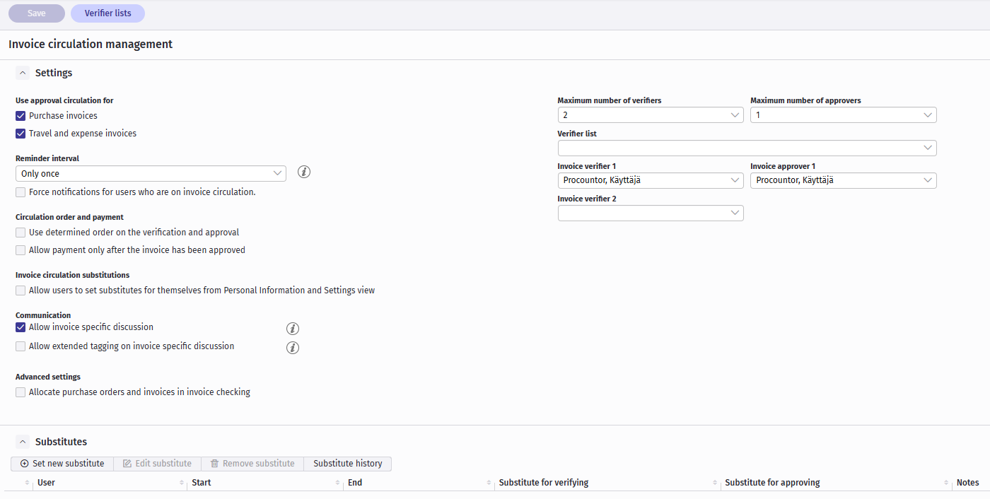 When the list has been selected from the Usage settings these verifiers and approvers will come automatically to all new purchase, travel and expense invoices. Note that if the verifiers and approvers have been selected to a specific supplier or customer this will overdrive the default approval circulation in the usage settings.