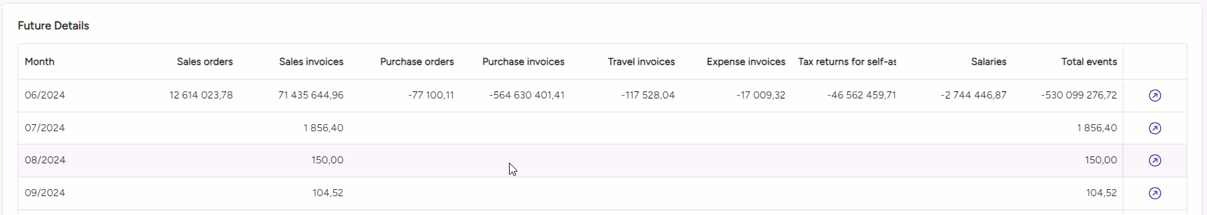 The lowest section of the Cash flow report a Future details grid shows the receipts that are expected to have an impact on the bank account balance in the future.