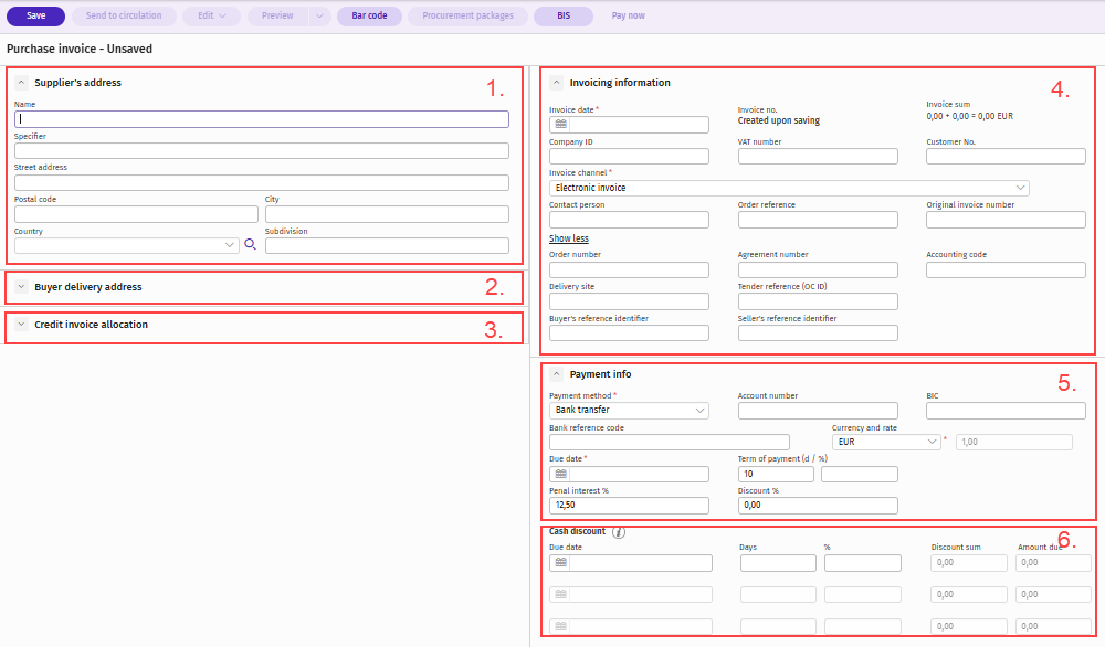 New purchase invoice view can be accessed from New > Purchase invoice. Next, by clicking Create a new invoice button on New purchase invoice view, the Purchase invoice view can be accessed.