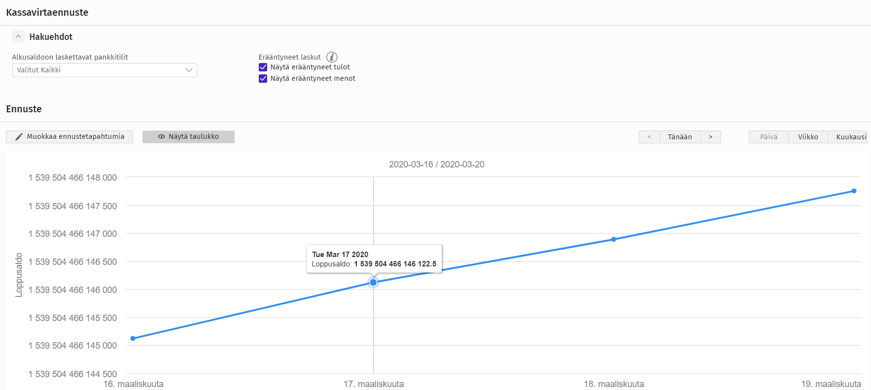 Kassavirtaennuste on mahdollista saada graafi-muotoon painamalla Näytä graafi -painiketta. Kaavion pisteet kokoavat kyseisen ajanjakson loppusaldon pisteiksi ja muokkautuu valitun ajanjakson mukaan.