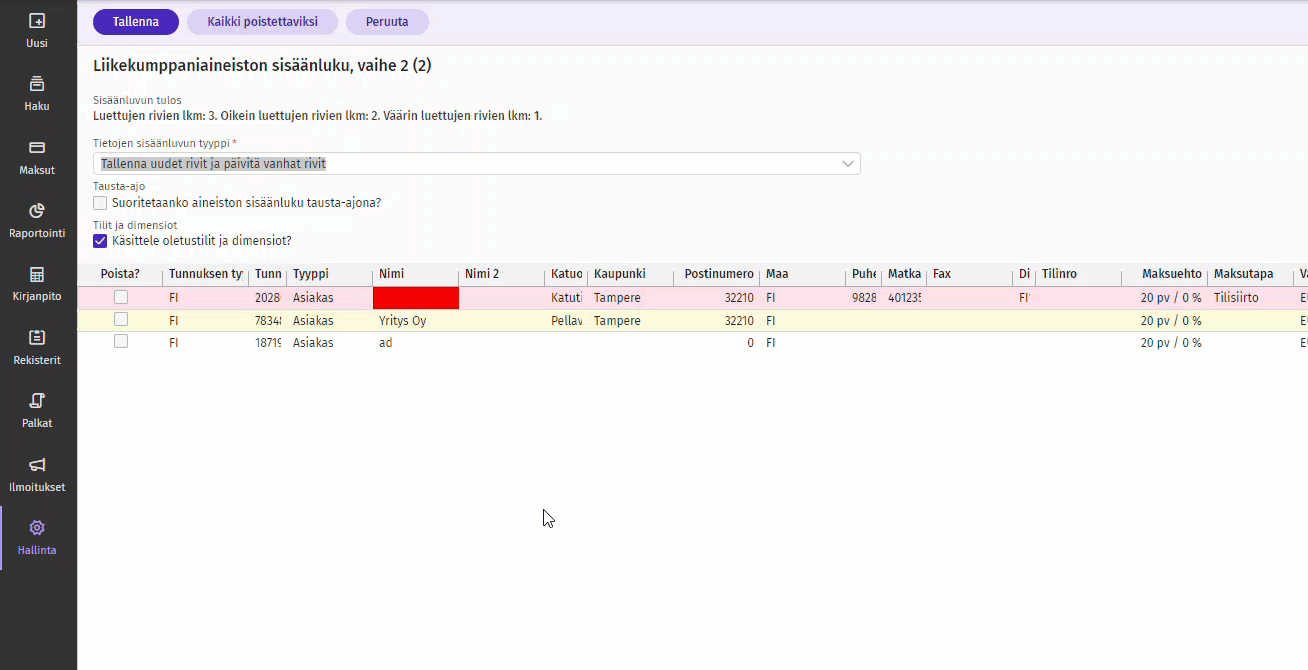Ladattu aineisto tulee ohjelmaan yhteenvetona tiedoston lataamisen jälkeen. Kyseisellä näkymällä on eriteltynä luettujen rivien (liikekumppaneiden) yhteismäärä sekä oikein ja väärin luettujen rivien määrät.