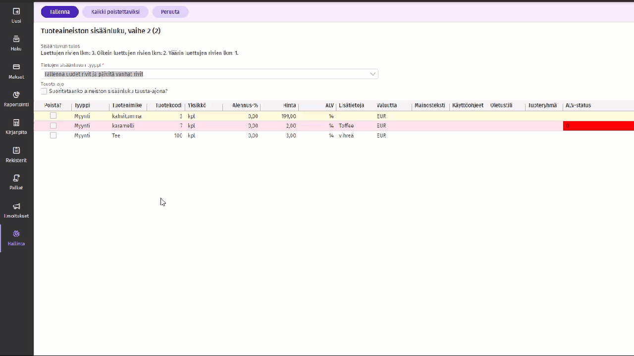 Jos sisäänluetussa tiedostossa on virheellisiä rivejä, ne näkyvät punaisina. Virheellisen rivin virheellinen sarake näkyy tummanpunaisena. Esimerkiksi, jos aineistolla tuotua kirjanpitotiliä ei löydy tilikartasta, näytetään Kp-tili -sarake punaisena. Mikäli aineistossa on virheellisiä rivejä, on syytä keskeyttää aineiston sisäänluku Peruuta-painikkeella ja korjata aineisto, minkä jälkeen se voidaan lukea uudelleen sisään.
