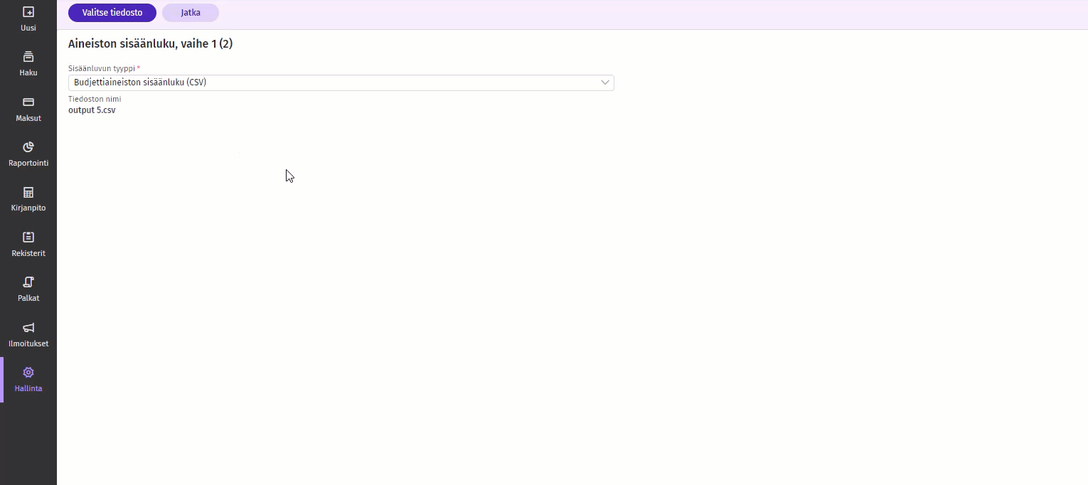 Paina näkymän yläreunan Valitse tiedosto -painiketta. Avautuvassa ikkunassa paina Valitse tiedosto -painiketta ja hae sisäänluettava tiedosto koneeltasi. Paina tämän jälkeen ikkunan Jatka-painiketta.