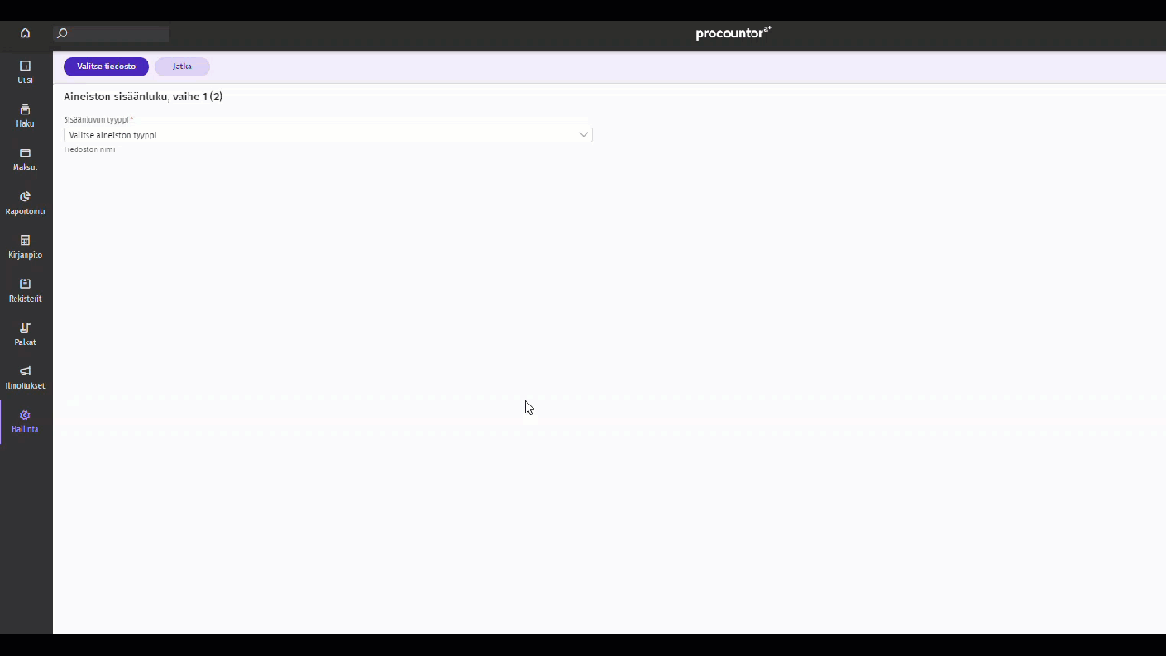 Aineiston sisäänlukun -toiminnon avulla Procountoriin voidaan tuoda aineistoa, joka on peräisin muista järjestelmistä, tai joka on luotu manuaalisesti esimerkiksi Excel-taulukkoon.