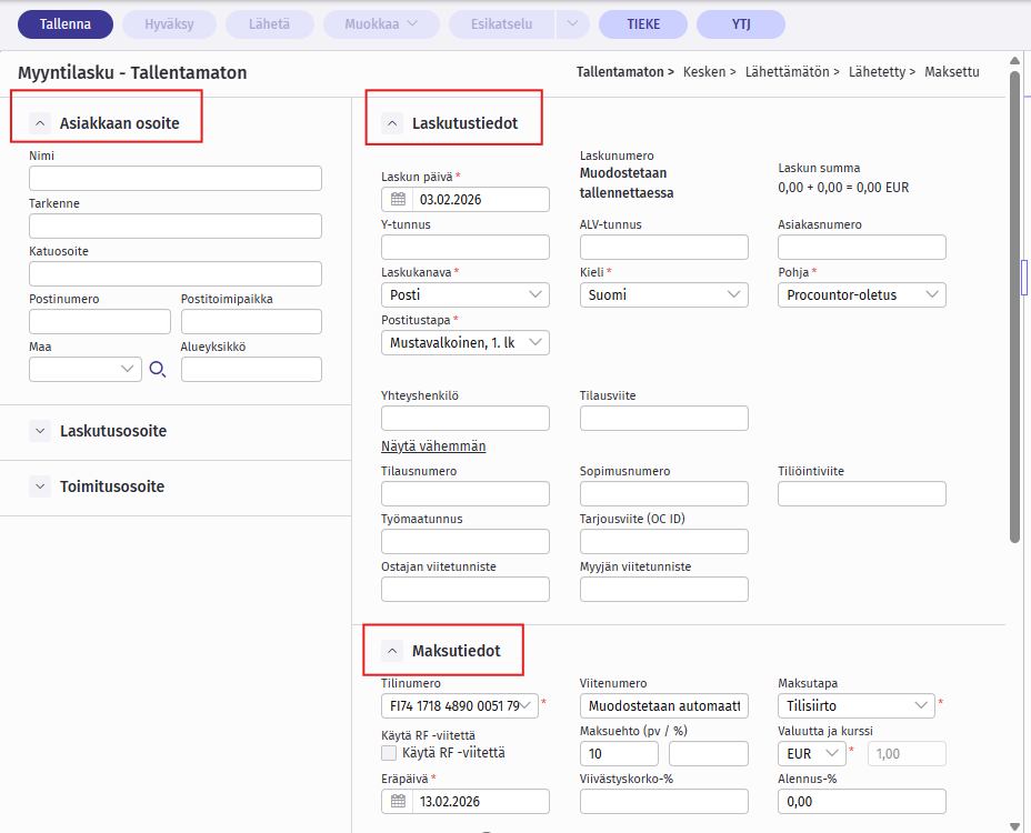 Luo myyntilasku Uusi myyntilasku -näkymän kautta kohdasta Uusi > Myyntilasku.