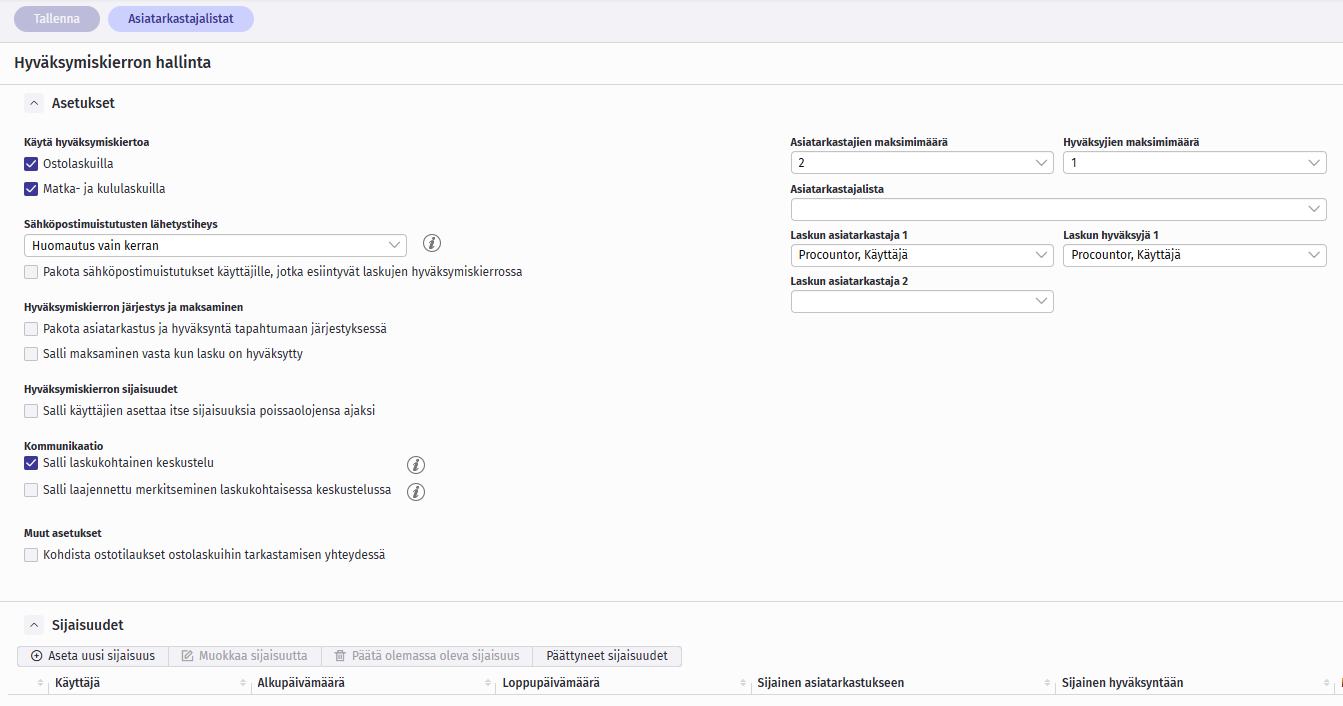 Mikäli asetus ei ole päällä, sijaisia voidaan määritellä ainoastaan Hyväksymiskierron hallinta -näkymän Sijaisuudet-osiossa.