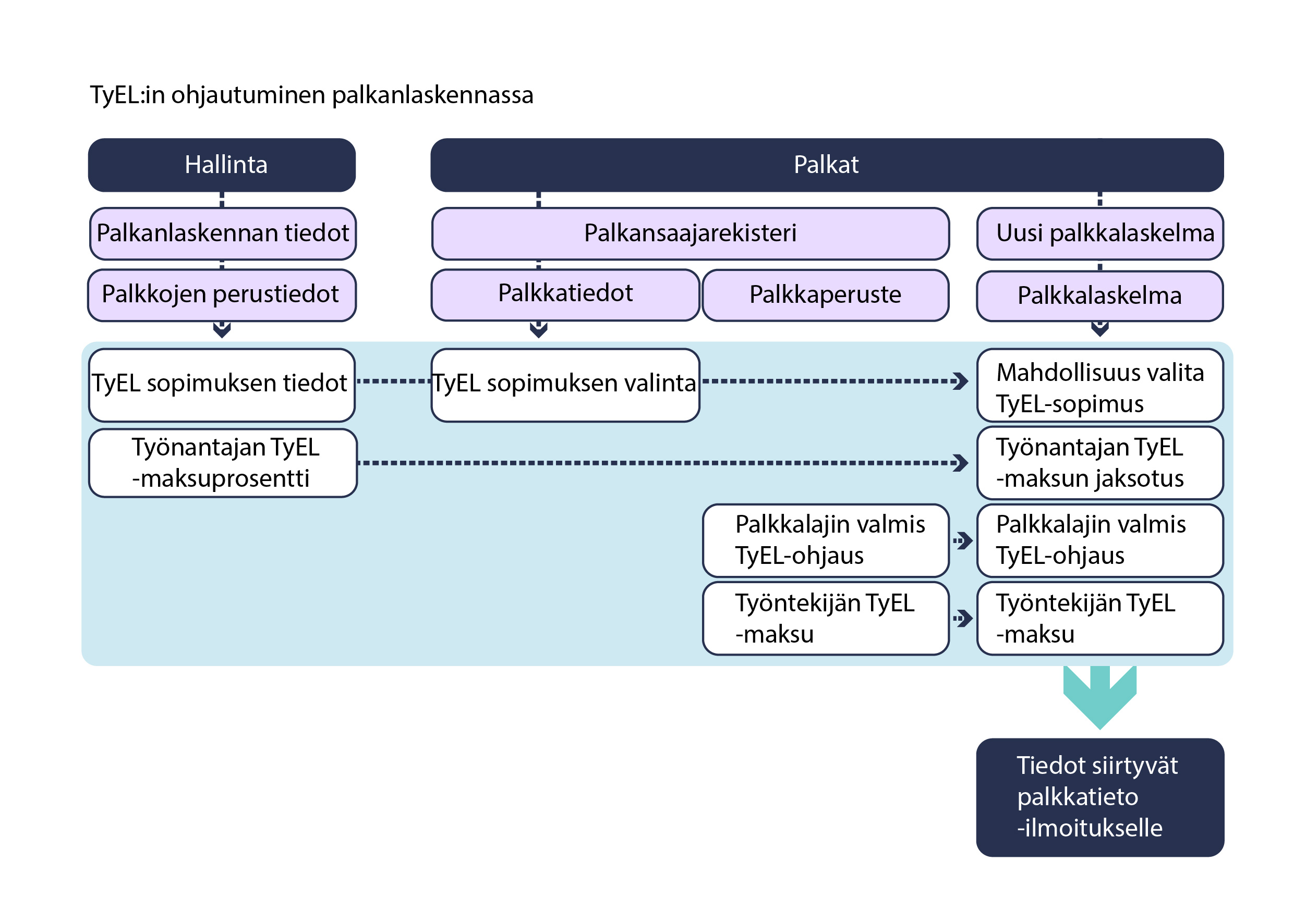 Alla olevassa kuvassa on kuvattu tavallista tilannetta, jossa palkansaaja kuuluu TyEL-vakuutuksen piiriin. TyEL-ohjausten avulla pyritään siihen, että palkkalaskelmalla työntekijältä pidätetään TyEL-maksun osuus ja työnantajalle muodostuu TyEL-maksun jaksotus. TyEL-sopimuksen määrittelyn avulla palkkatietoilmoitukselle saadaan nousemaan kaikki tarpeelliset vakuuttamisen tiedot.