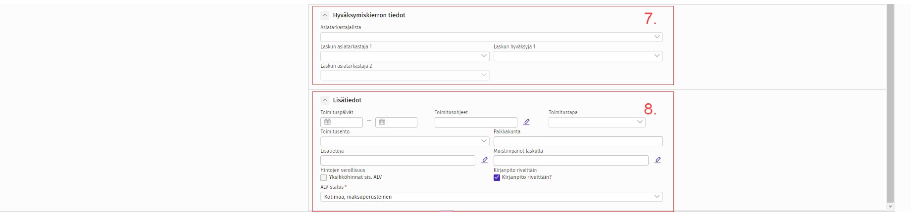 Jos ostolaskujen hyväksymiskierto on käytössä, tulee näihin kenttiin asiatarkastajien nimet. Asiatarkastajien sähköpostiosoitteet tulee olla syötettynä käyttäjän omiin tietoihin, jotta heille voidaan lähettää viesti käsittelyä odottavasta ostolaskusta.