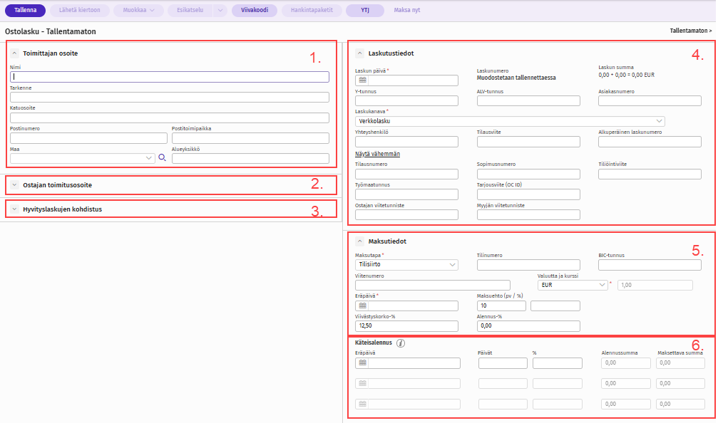 Tällä sivulla on kuvattu ostolaskulla käytettävissä olevat kentät ja painikkeet. Ostolaskun laadinta tapahtuu ohjelman päävalikon kohdasta Uusi > Ostolasku.