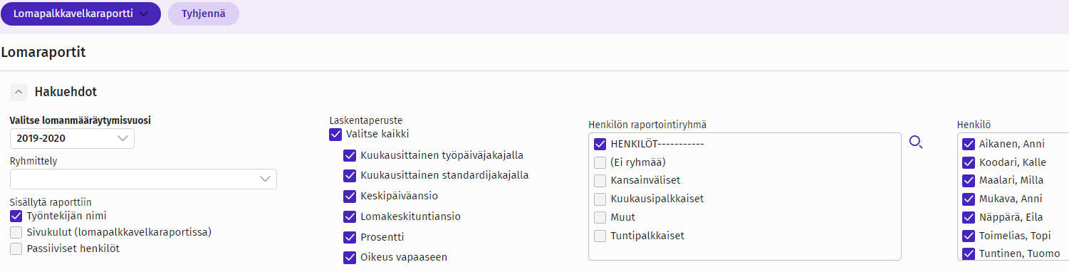 4. Valitse minkä lomalaskentaperusteen palkansaajia raportille haetaan.