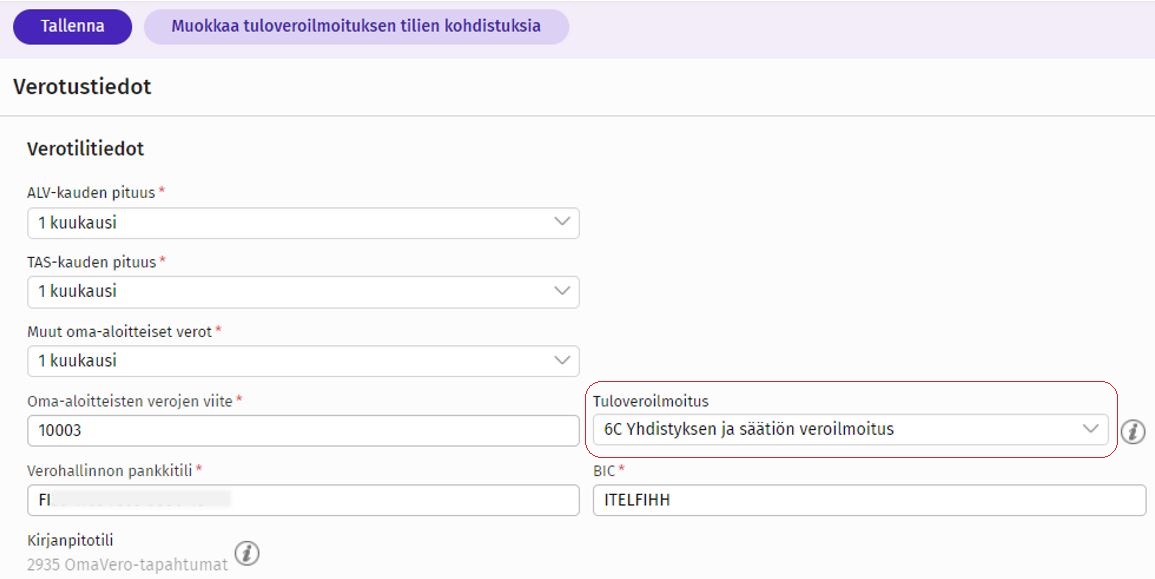 Käytettävä veroilmoituslomake valitaan ohjelman kohdassa Hallinta > Kirjanpidon tiedot > Verotustiedot, Tuloveroilmoitus - alasvetovalikosta. Yhdistyksen ja säätiön tuloveroilmoitus 6C:n lisäksi valittavana ovat Tuloveroilmoituslomakkeet 4, 5, 6A ja 6B.