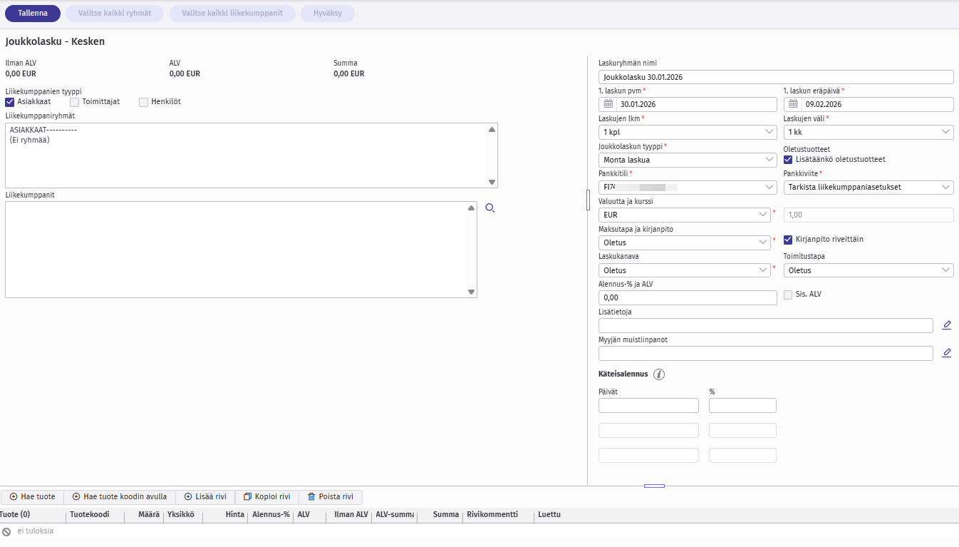 Näkymän yläreunassa olevalla Tallenna-painikkeella tallennetaan täytetyt laskun tiedot ja laskurivit. Huomioithan, että tallentamista ei kannata kuitenkaan tehdä liian aikaisin, koska tallentaminen lukitsee osan tiedoista (vastaanottajat, laskuryhmän nimi, annetut päivämäärät, laskujen lkm ja väli, joukkolaskun tyyppi, oletustuotteiden valinta ja pankkiviite).