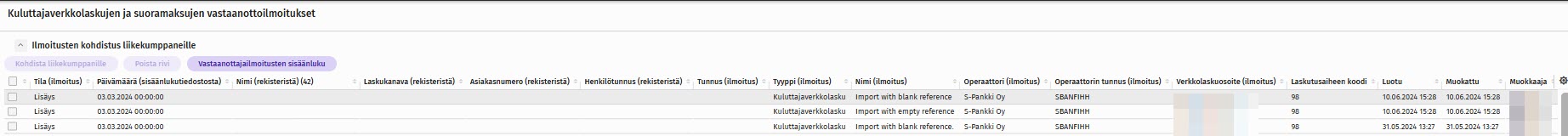 Vastaanottoilmoitukset-osio jakautuu kahteen osioon. Näkymän yläosan Ilmoitusten kohdistus liikekumppaneille -osiossa voi tarkastella saapuneita, kohdistamattomia vastaanottoilmoituksia ja kohdistaa niitä. Alaosan Kohdistetut kuluttajaverkkolaskujen ja suoramaksujen vastaanottoilmoitukset -osiossa voi hakea ja tarkastella jo kohdistettuja vastaanottoilmoituksia ja poistaa kohdistuksia.