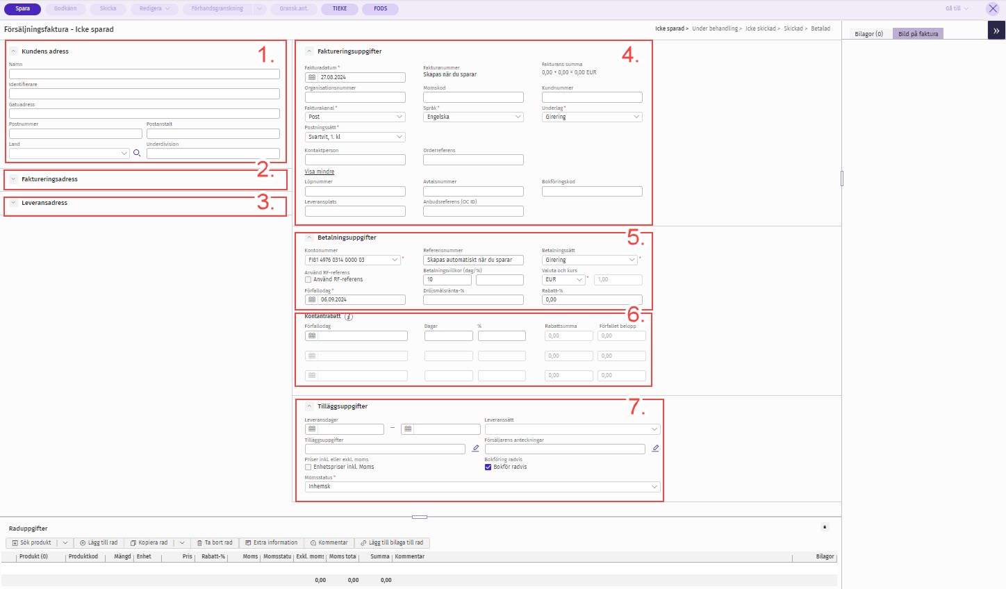 På denna sida presenteras fält och knappar på försäljningsfakturan. Artikeln nämner också några fält och knappar på försäljningsordern som skiljer sig från fälten och knapparna på försäljningsfakturan. För att komma till fakturavyen på försäljningsfakturan kan du antingen öppna en befintlig faktura via Verifikatssökning eller skapa en ny försäljningsfaktura i programmet under Ny > Försäljningsfaktura. Instruktioner för att skapa försäljningsfakturor finns här: Skapande av försäljningsfaktura.