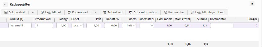 Knappen lägger till en tom fakturarad, där produktinformationen fylls i manuellt.